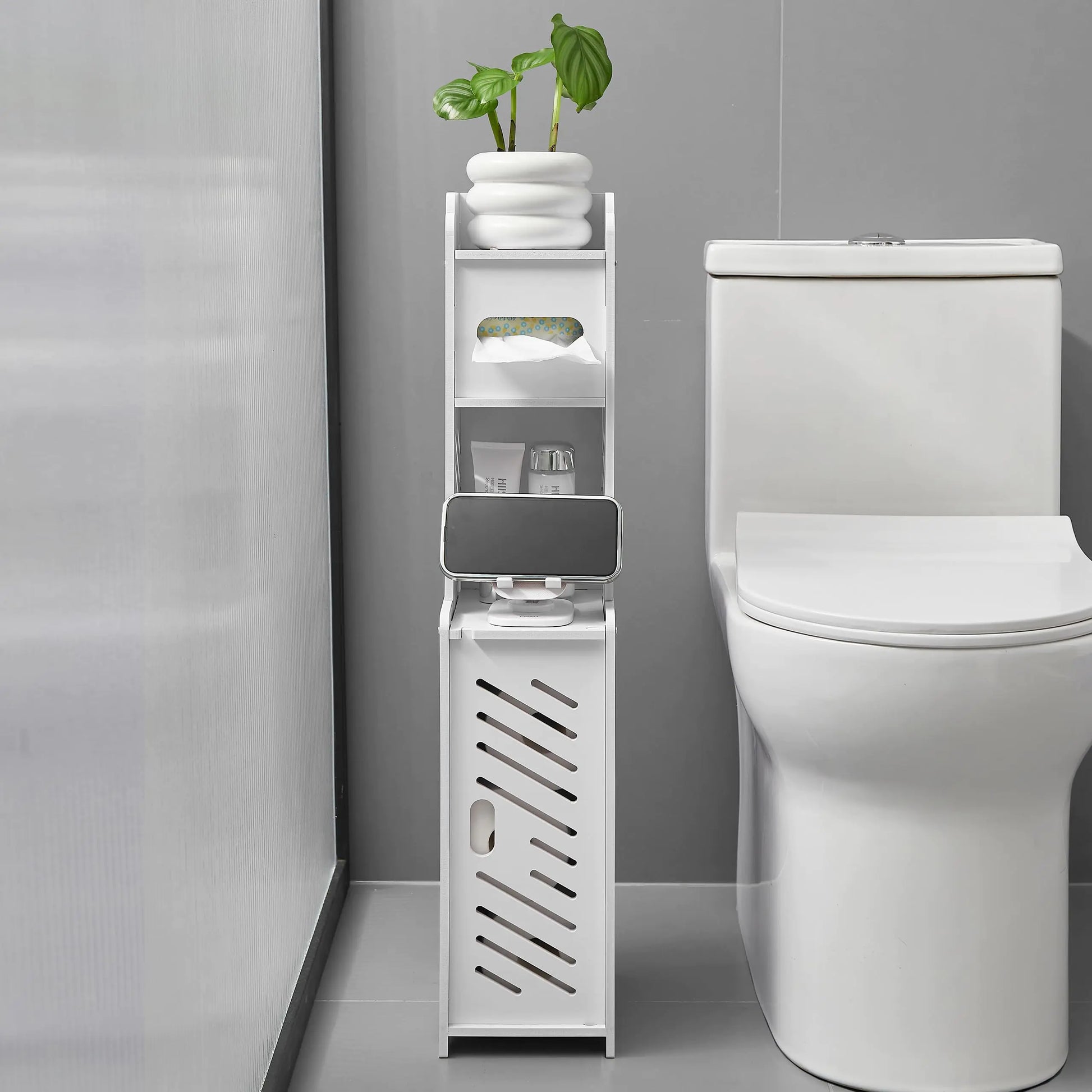 ["【Perfect for Narrow Space】The small bathroom storage cabinet size 6.2(W)x8.9(D)x30.7(H). It not only can be used as a bathroom storage cabinet also suitable for other narrow space in your house." "【Waterproof PVC Material】This toilet paper cabinet made of waterproof PVC(Polyvinyl Chloride) material lightweight but sturdy. Compare wood toilet paper storage cabinet the PVC toilet paper cabinet work great for bathroom storage you dont need worry about getting damp." 【Small Cabinet with Large Capacity】This bathroom storage cabinet has 4 shelves provides large storage space perfect for storing square facial tissues toilet paper bathroom cleaners cosmetic items decorations plants cell phone etc. It will help you keep the bathroom organized. 【Flexible】The door can be installed on left or right as you want. 【Easy Assemble】The bathroom storage cabinet package includes an assembly instruction to guide you quick assemble within 10 minutes. Goes together like a puzzle and then hold together with screws.]